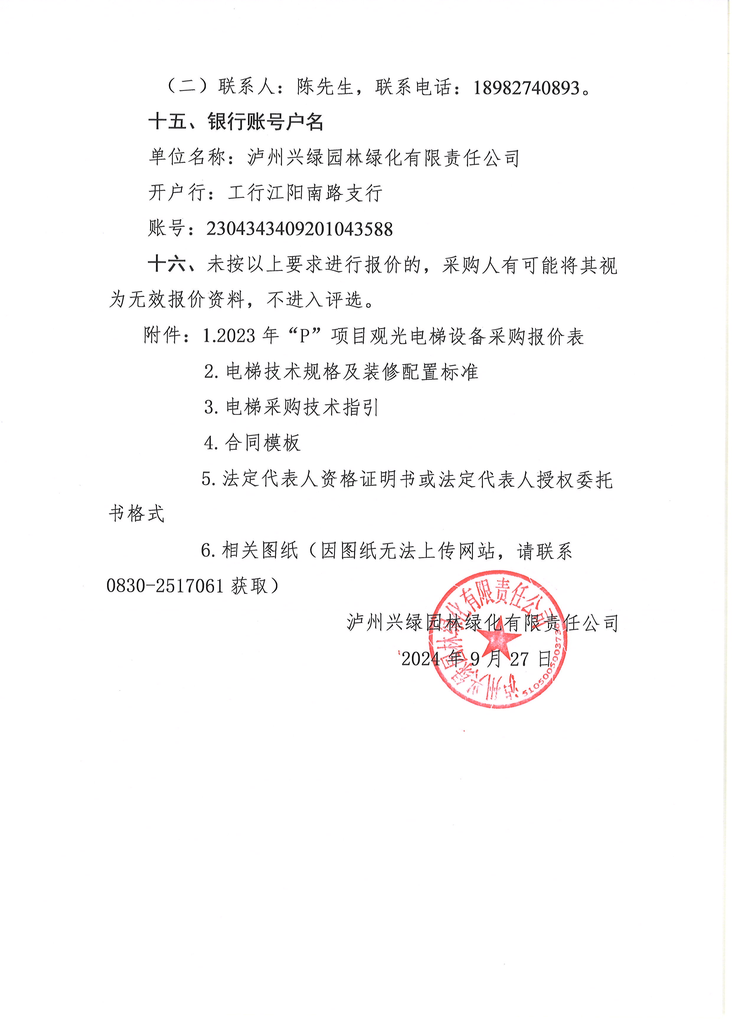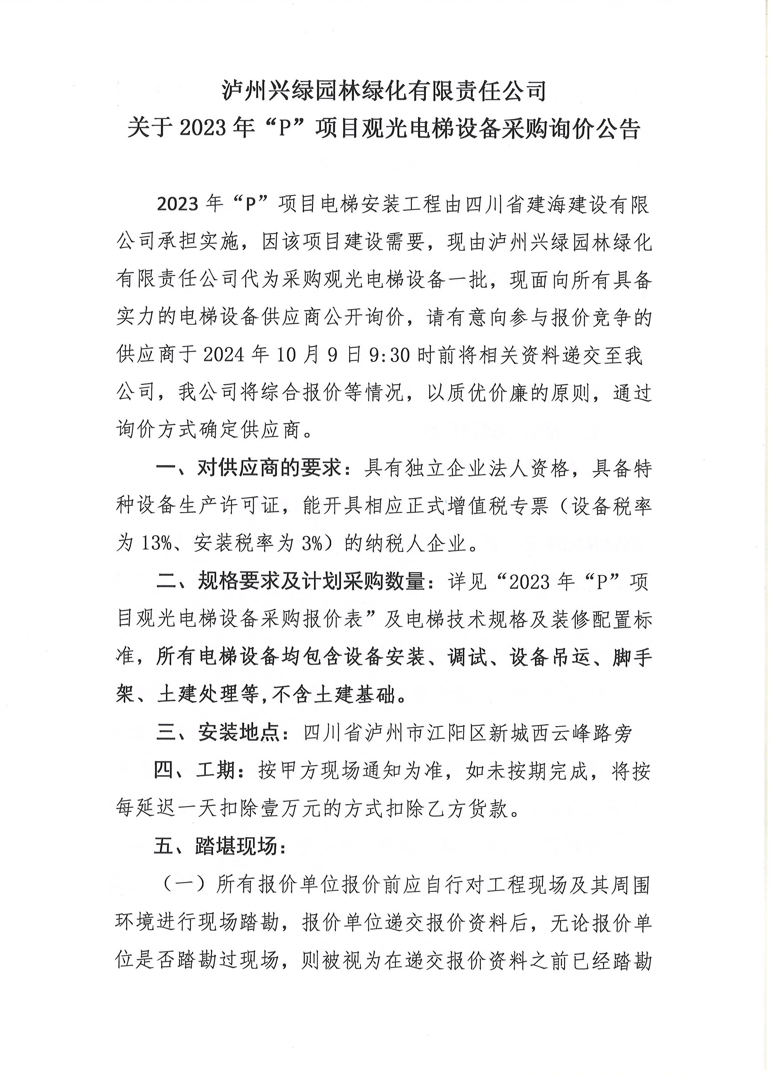 瀘州興綠園林綠化有限責(zé)任公司關(guān)于2023年“P”項(xiàng)目觀光電梯設(shè)備采購詢價(jià)公告