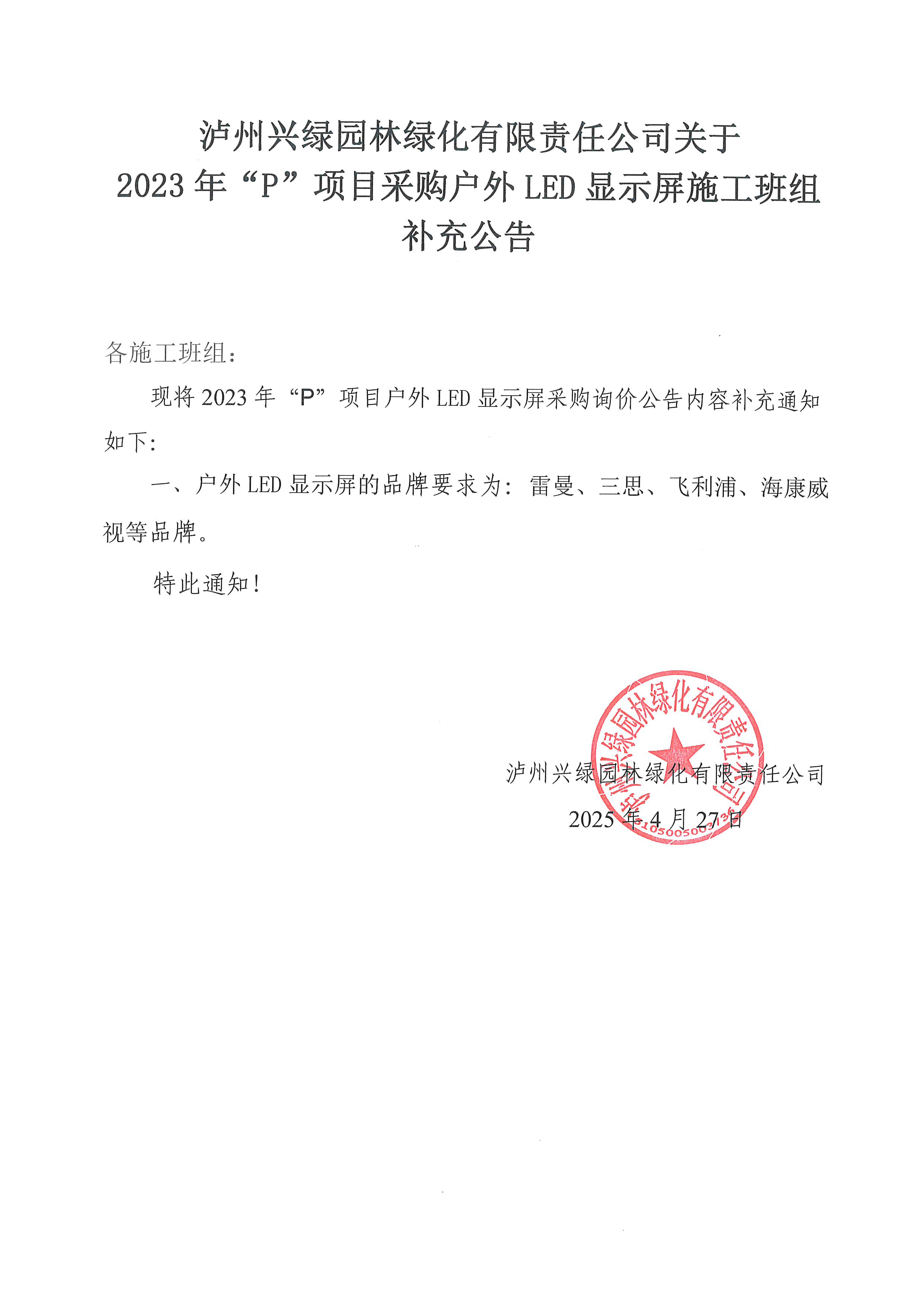 瀘州興綠園林綠化有限責(zé)任公司關(guān)于2023年“P”項(xiàng)目采購戶外LED顯示屏施工班組補(bǔ)充